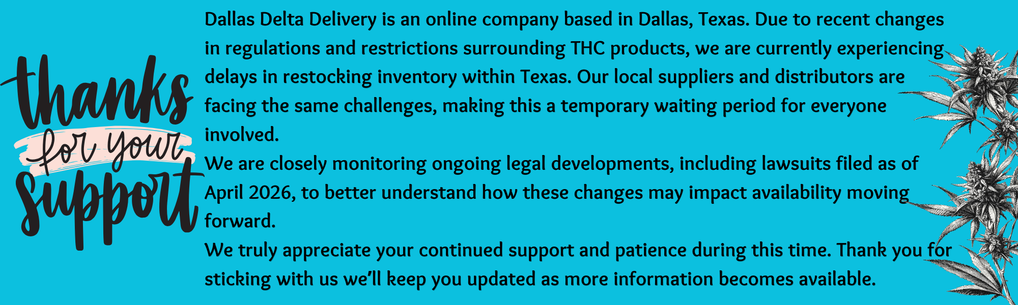 Dallas Delta Delivery is your go-to online CBD and hemp store based in Dallas, Texas. We specialize in high-quality CBD products, THCa flower, Delta-8, Delta-9, HHC, and hemp-derived wellness items. We proudly offer fast, local delivery within 20 miles of Plano, TX—including North Dallas, Richardson, Plano, McKinney, Garland, Irving, Princeton, Frisco, Carrollton, Allen, and surrounding areas. Whether you're shopping for CBD gummies, disposable vapes, thca prerolls, thca flowers, cartridges, pet cbd, lotions, exotic snacks, tinctures, or hemp flower, our Dallas-based delivery service brings premium, lab-tested hemp products directly to your door. Enjoy same-day discreet CBD delivery and shop confidently with Dallas Delta Delivery—your trusted source for legal hemp and cannabis alternatives in the DFW area.